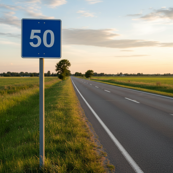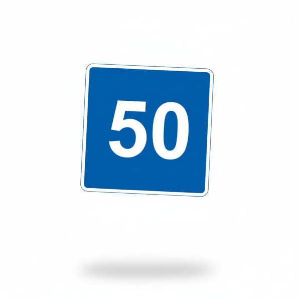 Цей дорожній знак вказує на рекомендовану швидкість руху на дорозі, що допомагає водіям зменшити ризик аварій та зберегти безпеку на дорозі. Його яскраві кольори та чітке зображення привертають увагу та допомагають вчасно зробити рішення.