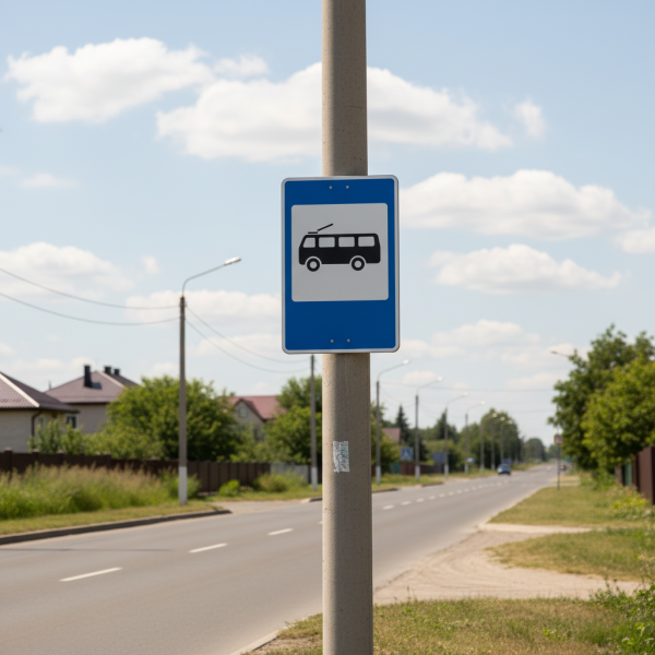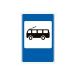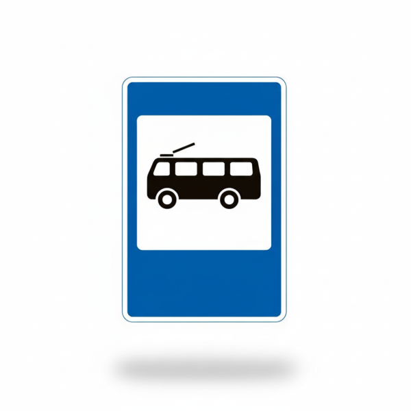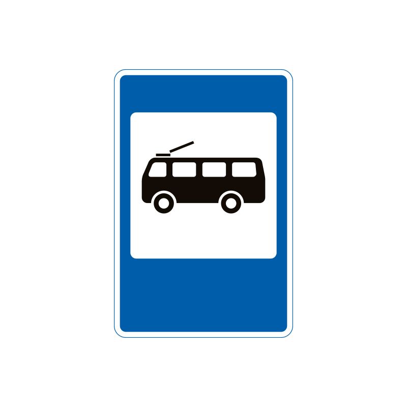 Цей дорожній знак позначає місце, де тролейбус здійснює посадку та висадку пасажирів. Його встановлюють біля зупинок тролейбусів для забезпечення безпеки пасажирів та водіїв. Знак має чітке впізнавання, що допомагає пасажирам знаходити необхідну зупинку.