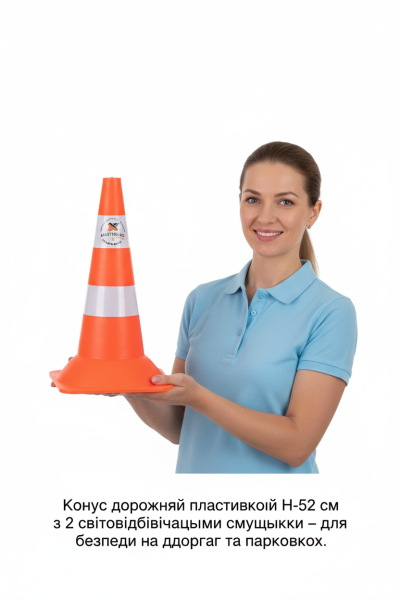 Конус дорожный пластиковый Н-52 см с 2 светоотражающими полосками – надежный помощник для повышения безопасности на дорогах и других зонах с высоким транспортным движением. Изготовлен в Украине из качественного пластика, обеспечивает максимальную видимость и долговечность.