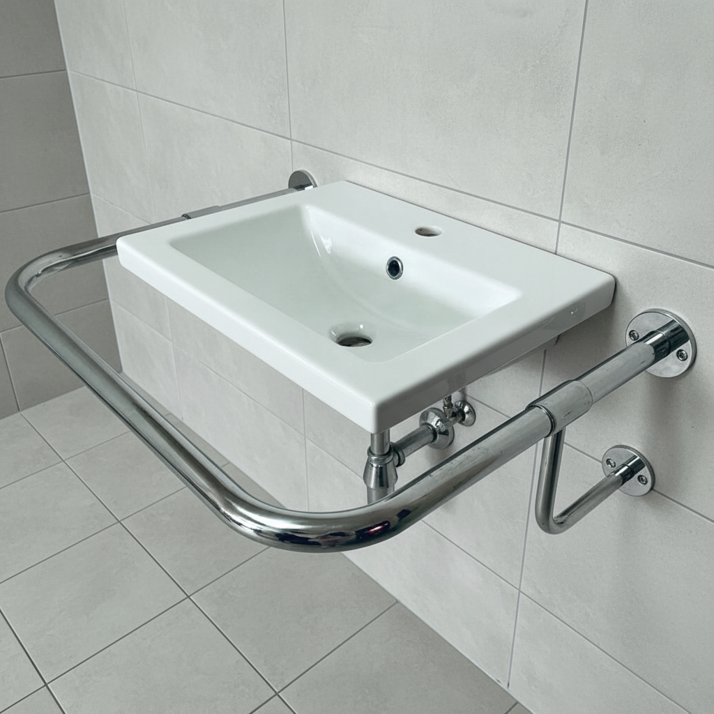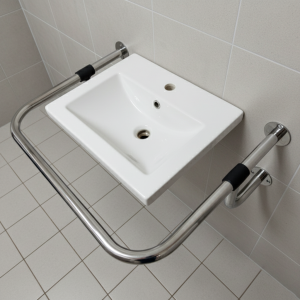 Поручень для мойки "стена-стена" для людей с инвалидностью 32мм – 530х710 мм предназначена для обустройства доступных санузлов и умывальных зон. Устанавливается рядом с раковиной и обеспечивает надежную опору людям с ограниченными возможностями, снижая нагрузку на мойку.