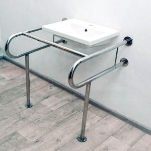 Усиленный поручень для мойки «стена-пол» создан для людей с ограниченными возможностями и маломобильными группами. Он позволяет опираться и вставать с коляски , а также защищает умывальник от чрезмерной нагрузки. Конструкция используется как антивандальное ограждение в больницах, поликлиниках и общественных местах, обеспечивая безопасность и долговечность.