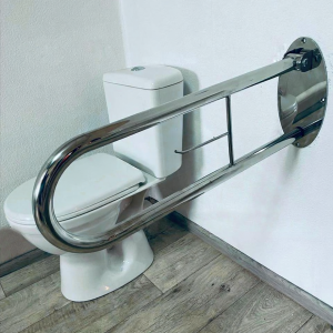 Этот поручень устанавливается у унитаза. Откидная конструкция не мешает перемещению, уборке и использованию унитаза другим членами семьи. Также на перилах есть держатель для туалетной бумаги.