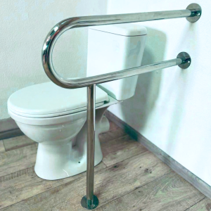 Стационарный поручень «стена-пол» обеспечивает надежную опору у унитаза. Конструкция усилена и стабильна благодаря креплениям к стене (2 шт) и полу (1 шт). Идеально подходит для людей с ограниченными возможностями, нуждающихся в дополнительной точке опоры.