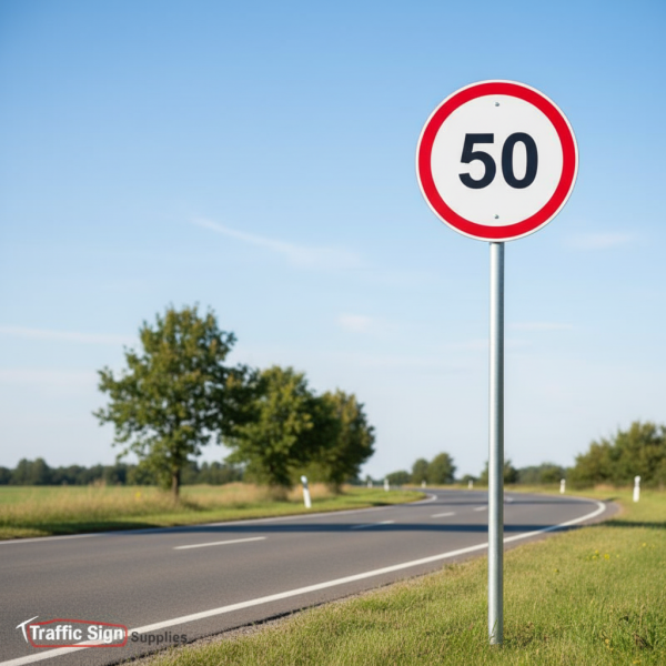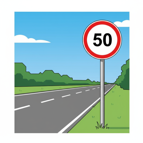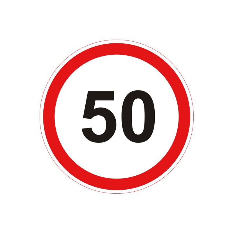 Цей дорожній знак вказує на необхідність дотримуватися обмеження швидкості на дорозі. Встановлюється з метою забезпечення безпеки дорожнього руху та уникнення аварійних ситуацій.