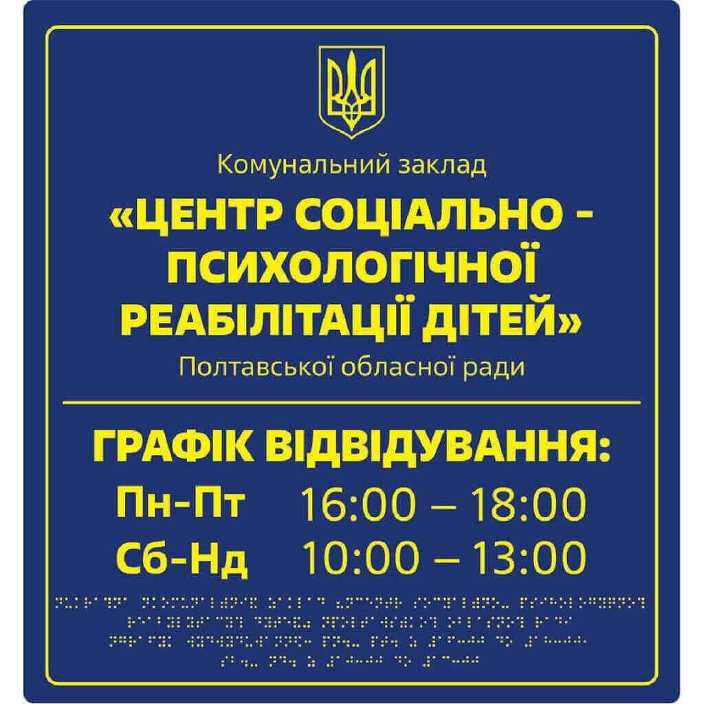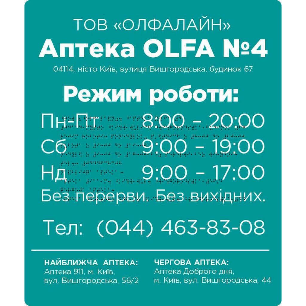 Тактильний ефект Матеріал – ПВХ, композит Розмір та ціна: 420x450x3 мм Мова: англійська, українська, шрифт Брайля Опис Виготовляємо таблички потрібного Вам розміру і кольору. Ми виготовляємо фасадні вивіски з рельєфно-крапковим шрифтом Брайля. Виготовлені з алюмінієвих панелей, їхня кольорова гама різноманітна, підходить для будь-якого фасаду. Наша інформаційна вивіска для медичних закладів та аптек зі шрифтом Брайля – важливий елемент для доступності. Забезпечує комфорт не тільки для осіб на інвалідних візках, а й для незрячих. Чому важлива фасадна вивіска? Доступність: Полегшує ідентифікацію закладів медичної сфери для людей із порушеннями зору. Інклюзивність: Підкреслює повагу до потреб усіх відвідувачів, включно з незрячими. Незалежність: Дозволяє незрячим самостійно орієнтуватися. Відповідність нормам: Допомагає установам відповідати вимогам доступності. Гарантійний термін експлуатації вивісок на вулиці 1 рік. Доставка по території України здійснюється за допомогою служби доставки Нова пошта.