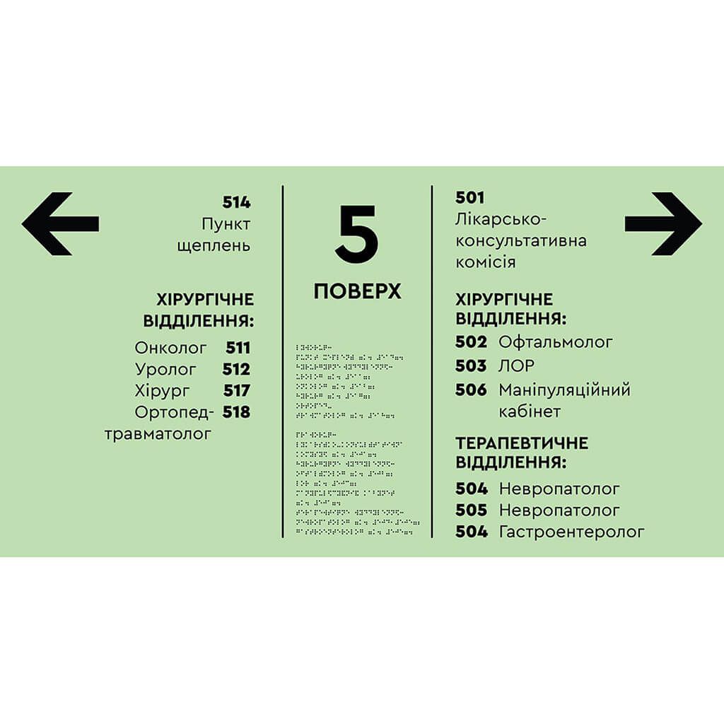 Тактильний ефект Матеріал – ПВХ, композит Розмір та ціна: 600x800x3 мм Мова: англійська, українська, шрифт Брайля Опис Виготовляємо таблички потрібного Вам розміру і кольору. Цей інформаційний стенд призначений для людей з вадами зору та полегшує їм орієнтування в будівлі. Він обладнаний тактильними покажчиками та шрифтом Брайля, які дозволяють їм самостійно знайти потрібний кабінет чи відділення. Переваги: Доступність: Люди з вадами зору можуть самостійно отримати інформацію про розташування кабінетів та відділень, не потребуючи допомоги інших. Зручність: Тактильні покажчики та шрифт Брайля легко читаються на дотик, що робить використання стенду простим та зручним. Інклюзивність: Стенд робить будівлю доступною для людей з вадами зору, дозволяючи їм вільно та самостійно пересуватися. Стенд виготовлений з міцного матеріалу та має чітку структуру. На ньому розміщені тактильні покажчики, які відповідають поверхам будівлі. Кожен поверх має свій номер, позначений тактильним знаком та шрифтом Брайля. Поруч з тактильними знаками розміщені написи зі шрифтом Брайля, які вказують на розташування кабінетів та відділень на даному поверсі. Доставка по території України здійснюється за допомогою служби доставки Нова пошта.