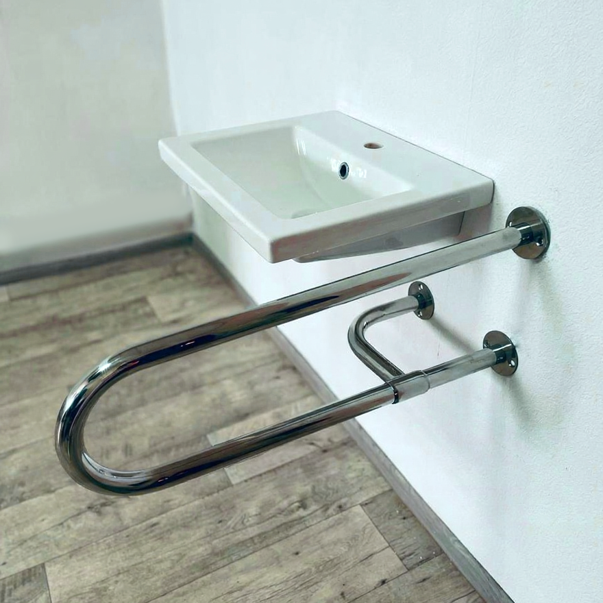 Поручень пристінний посилений для раковини забезпечує додаткову точку опори, щоб у процесі вмивання людина з обмеженими можливостями не спиралася на раковину. Завдяки поворотній ніжці цей поручень можна встановлювати як праворуч, так і зліва від раковини. нержавіючі поліровані фланці у стіну - 3 шт.